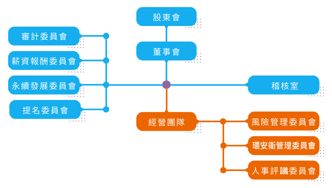 另外,由總經理擔任召集人,由經營團隊依其權責組成風險管理委員會、環安衛管理委員會及人事評議委員會。